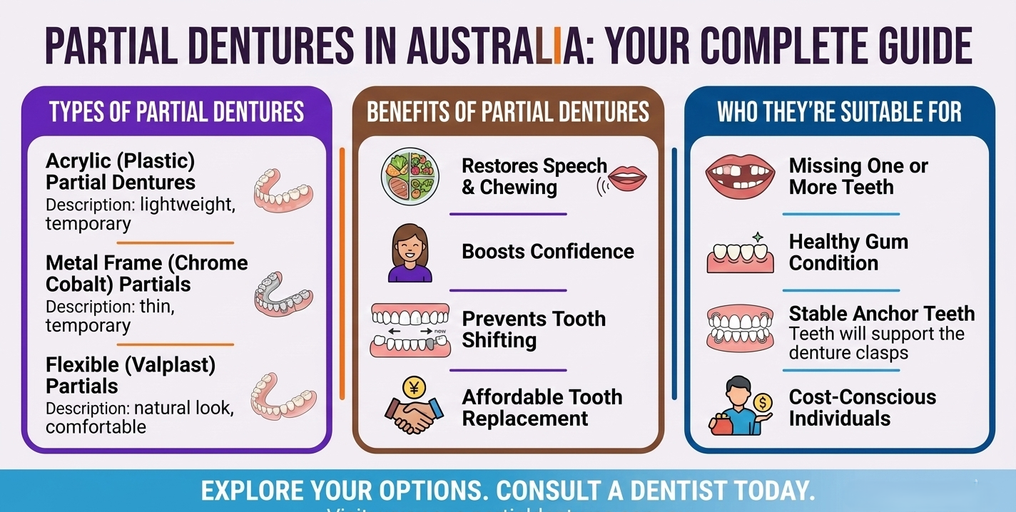 Partial dentures can restore function and confidence when you have missing teeth but still have healthy natural teeth remaining. The right choice depends on more than the number of gaps. Material, design, bite balance, and gum health all influence comfort and long term safety. If you are considering a partial denture, aim for a plan that protects supporting teeth, allows thorough cleaning, and includes follow up reviews. With careful assessment and maintenance, partial plate teeth can be a practical option for many Australians.